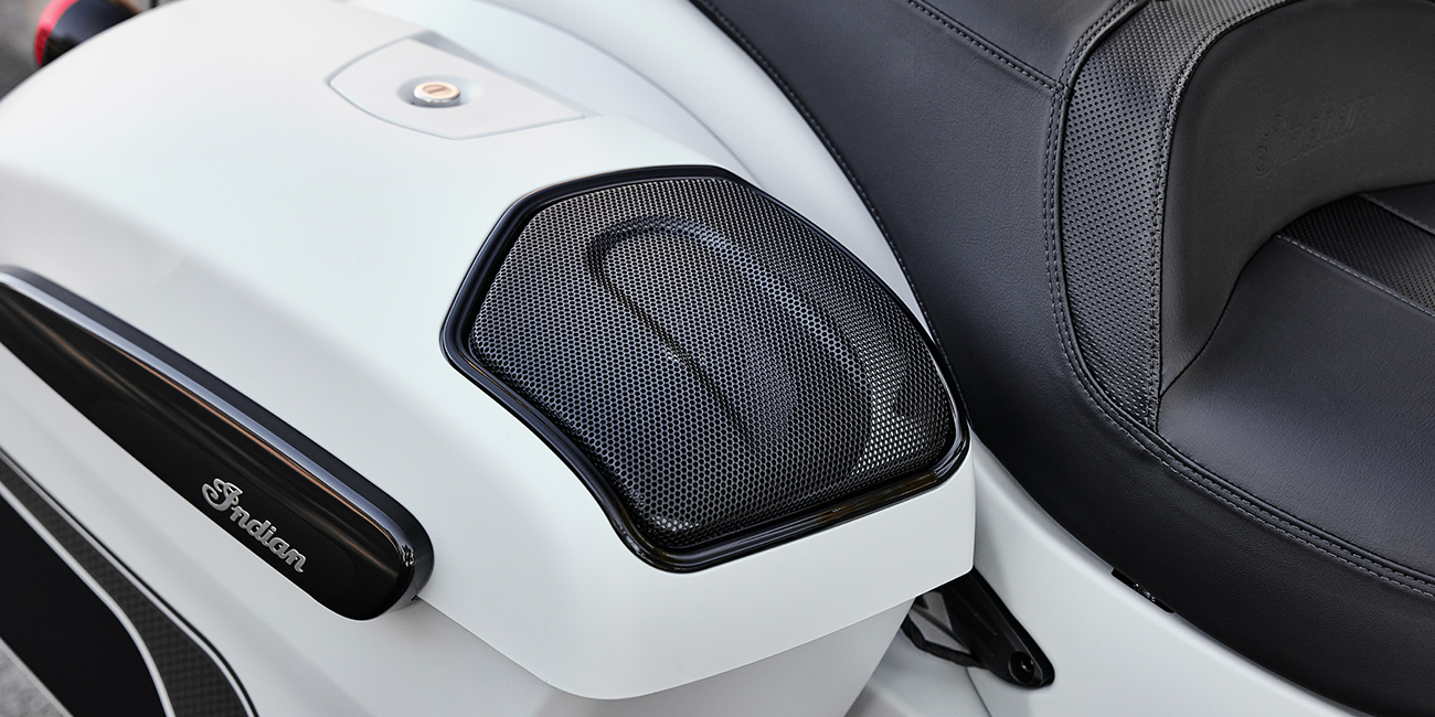 Hör varje ton med krispig klarhet från de kåpmonterade 100-Watts-högtalarna. Den dynamiska equalizern justerar automatiskt för väg-, vind- och motorljud.